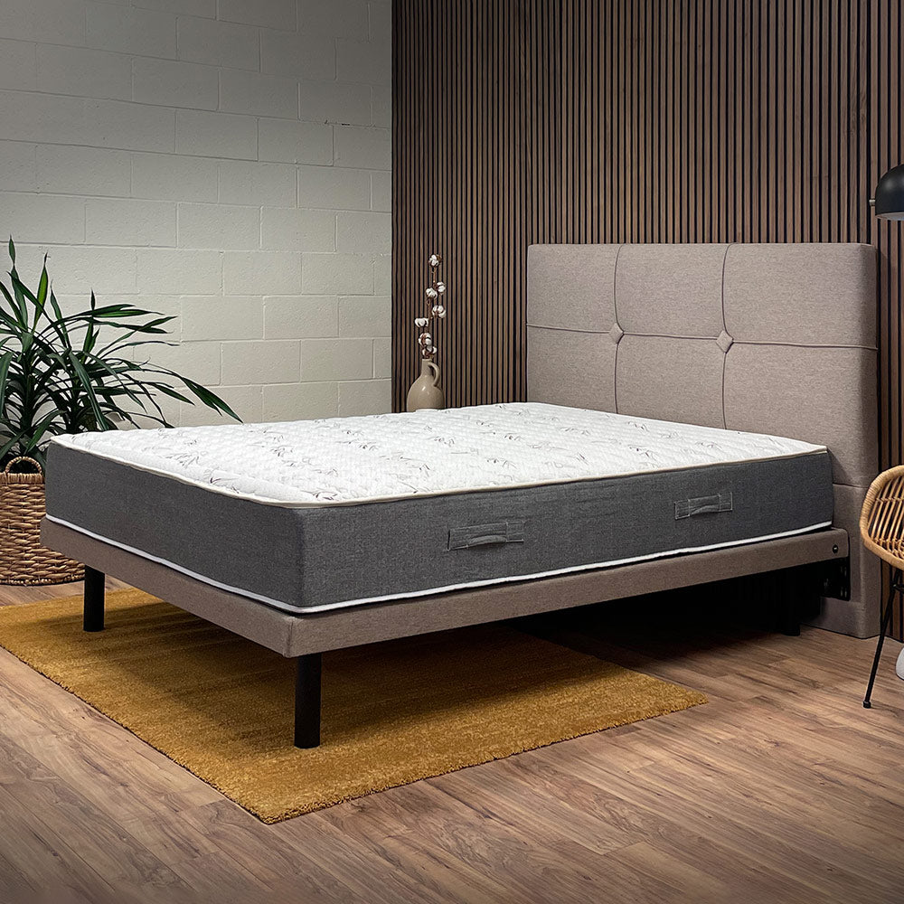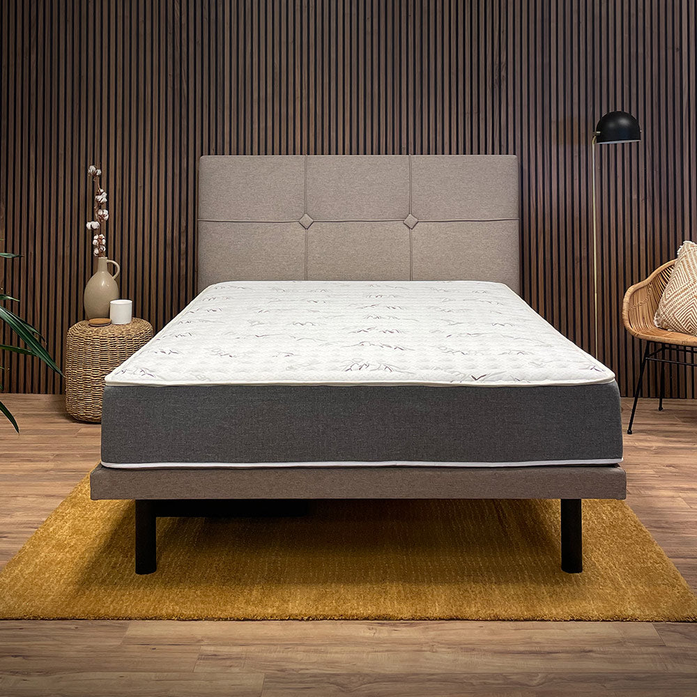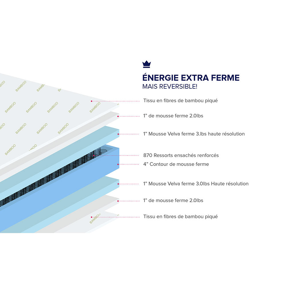 Notre matelas le plus ferme, réversible afin de pouvoir utiliser les deux côtés. Les matelas réversibles durent plus longtemps car vous utilisez les deux côtés du matelas de manière égale. Tout indiqué pour ceux qui désirent un matelas dur. Tous les ressorts ensachés sont « décalés » (comme des alvéoles de nid d'abeille) et les ressorts ensachés sont recouverts d'une mousse haute densité de 3,0 lb avec un ILD de 40. Le calibre des ressorts est de 13,5, ce qui est plus épais que la norme. Des bobines plus épaisses signifient un matelas plus dur. Le matelas est plus dur puisque ses ressorts sont plus épais. Il est fini avec un tissu respirant en bambou, matelassé d'une mousse ferme de densité 2,0 lb. La surface de ce matelas est également ferme.