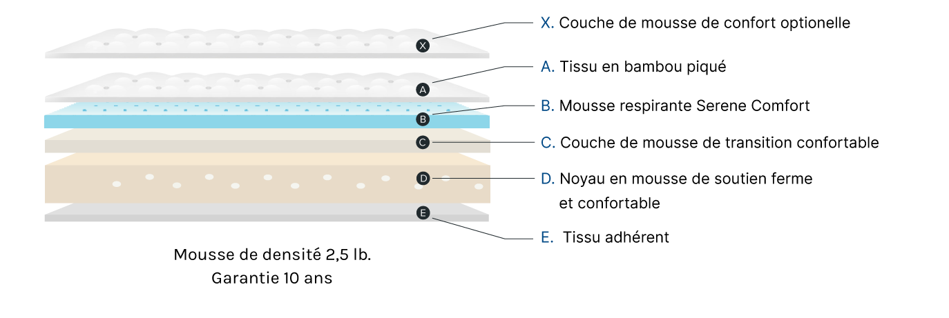 La mousse Serene® s'adapte à votre corps : elle soulage la pression, régule la température et améliore la circulation de l'air pour un sommeil frais et réparateur.