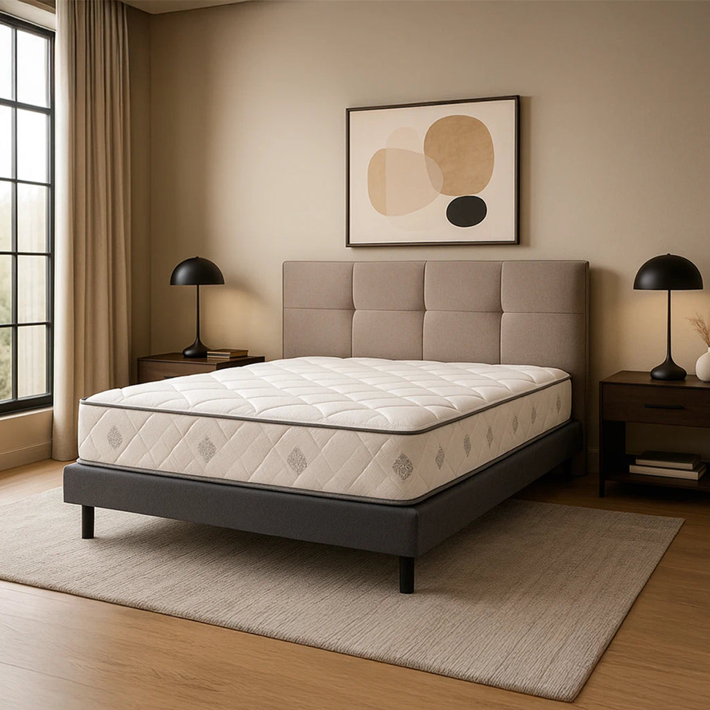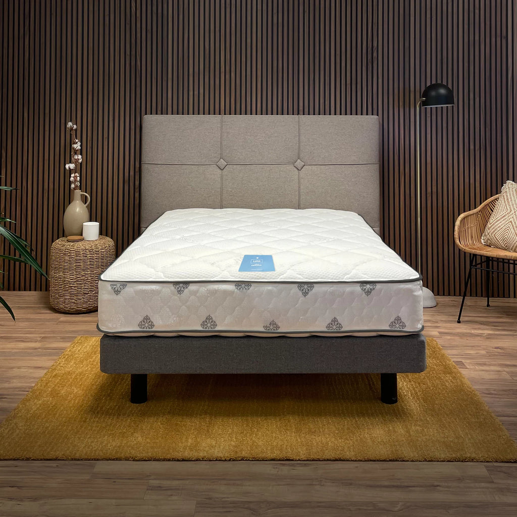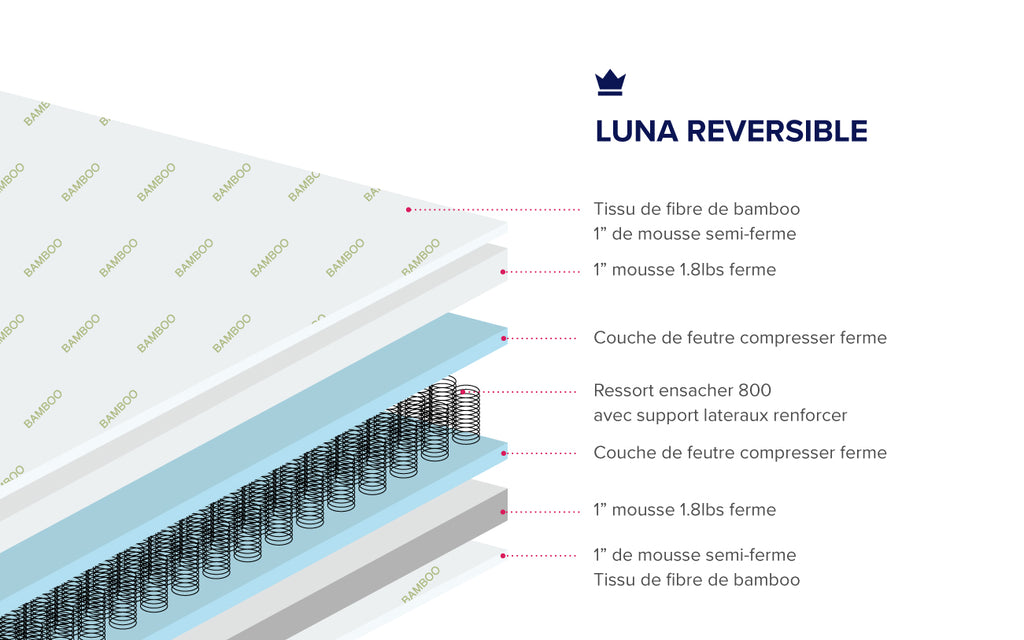 Our Luna Reversible mattress is constructed with an open pocket coil spring construction. The perimeter is reinforced with our ‘’Edgeguard’’ lateral support system which is welded to the perimeter of the pocket coils. The Luna is finished with a layer of compressed cotton felt, high-density foam, and a quilted Bamboo fabric on both sides of the mattress. The Luna reversible has a 15 year garantie.