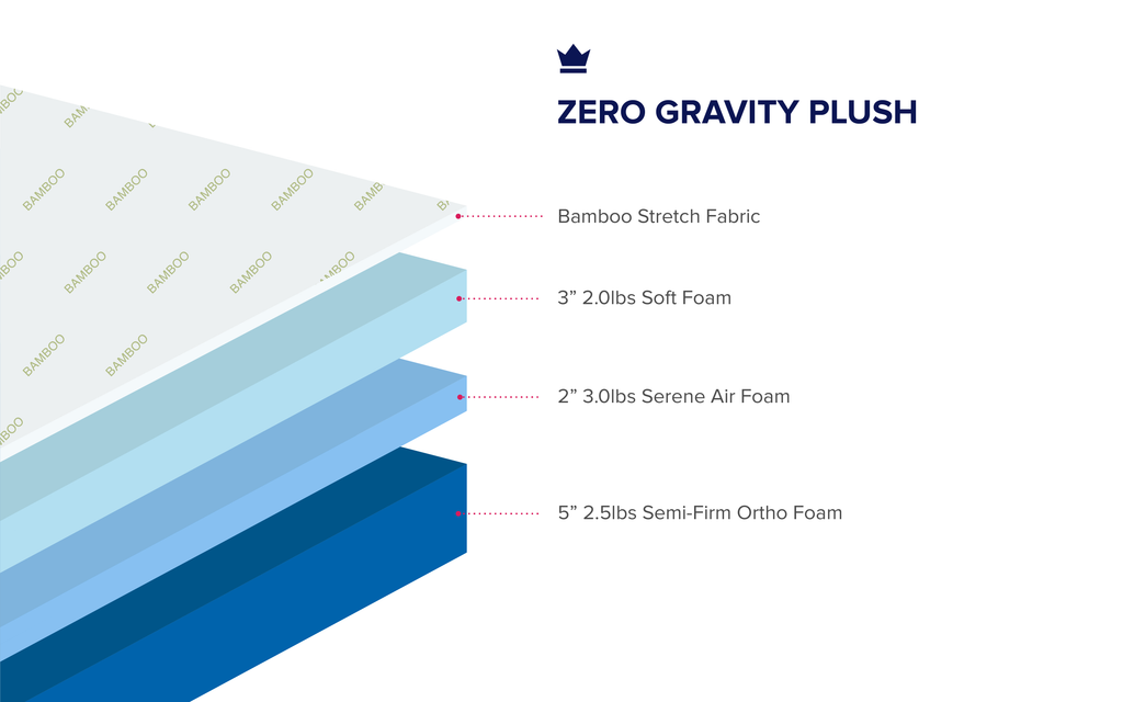 The Zero Gravity Plush is for those who want a softer mattress without the high price that comes with Talalay Latex. It's a semi-firm to soft feeling mattress comprised of 3 layers of foam. The Middle layer still has our Serene Airflow foam for comfort and absorption of pressure points. The mattress is finished with a Bamboo fabric quilted with a plush 1.8lbs convoluted foam for extra surface comfort.